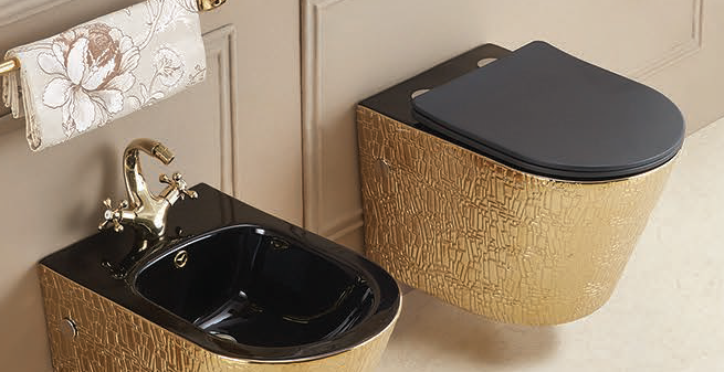 Во-первых это коллекции унитазов и биде Q-Line и Piatti в эксклюзивной отделке — текстурное золотое покрытие внешней чаши и черное глянцевое покрытие внутри, унитазы укомплектованы черной крышкой