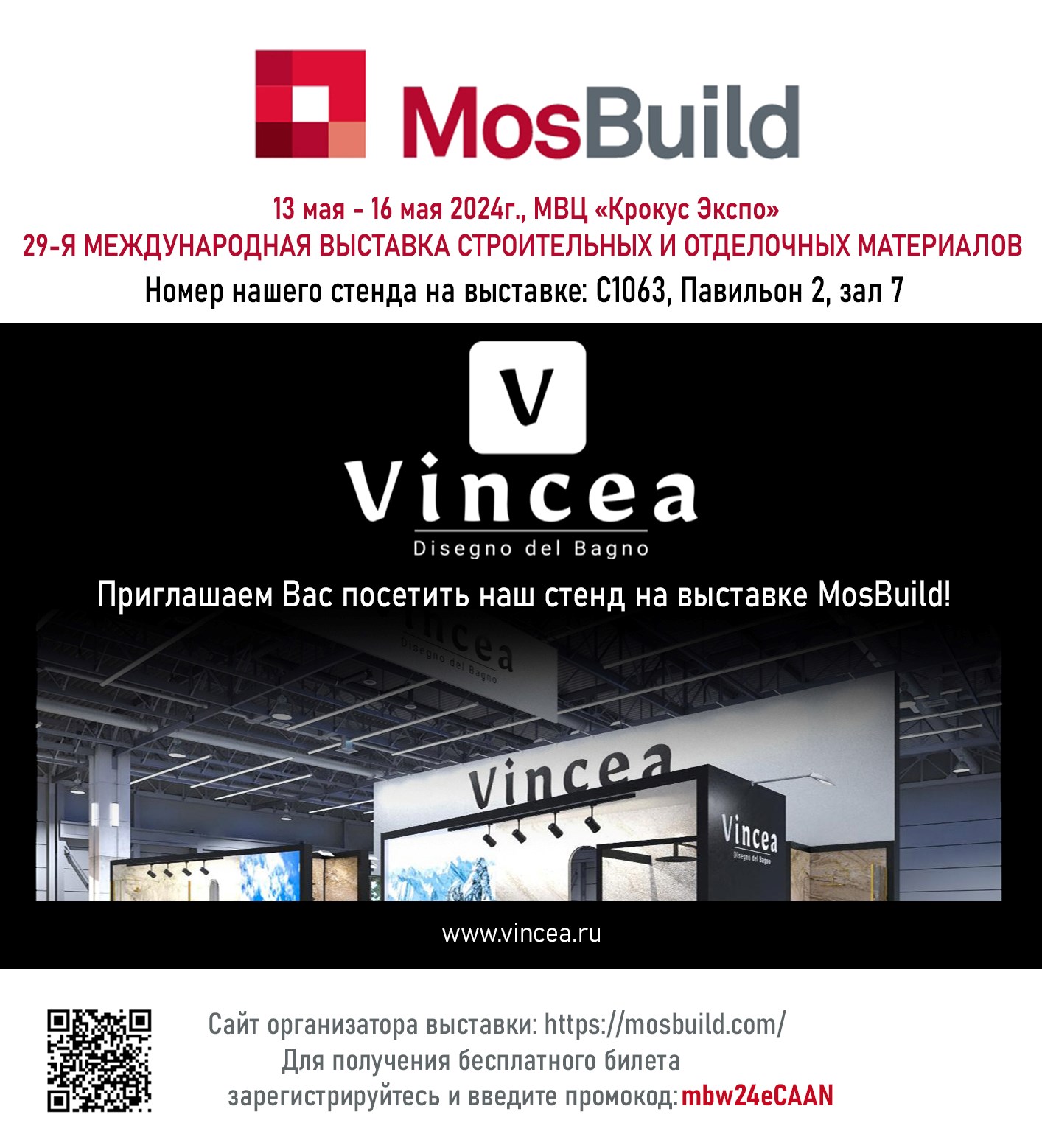 Номер стенда Vincea на выставке: С1063, Павильон 2, зал 7. Сайт организатора выставки https://mosbuild.com/